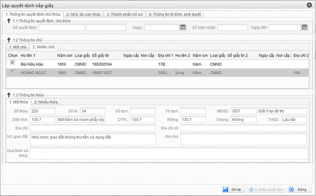 - Người dùng nhập thông tin quyết định cấp giấy, kích chọn Ghi lại để lưu thông tin vào CSDL