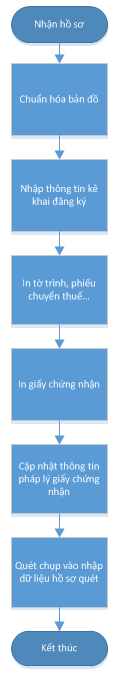 Giải thích quy trình - Bước 1. Chuẩn hóa bản đồ: Chỉnh lại thửa đất không gian cho đúng với tình hình thực tế đo đạc của thửa đất (Dùng phần mềm chỉnh lý riêng) - Bước 2. Nhập thông tin kê khai đăng ký: nhập các thông tin kê khai đăng ký cấp giấy chứng nhận từ việc: Nhập thông tin địa chính. Tạo đơn đăng ký cấp giấy, Nhập thành phần giấy chứng nhận - Bước 3. In tờ trình, phiếu chuyển: In các loại giấy tờ liên quan để trình lãnh đạo ký - Bước 4. In giấy chứng nhận: In giấy chứng nhận của thửa đất - Bước 5. Cập nhât thông tin pháp lý giấy chứng nhận: Sau khi giấy chứng nhận đã được in ra cập nhật tính pháp lý cho giấy chứng nhận trong hệ thống - Bước 6. Quét chụp vào nhập dữ liệu hồ sơ quét: Quét chụp hồ sơ gốc của giấy chứng nhận (các giấy tờ trong hồ sơ gốc được quét/chụp qua máy chuyên dụng thành định dạng file PDF)