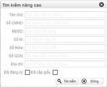 -Đối với các trường tên chủ, số CMND, MDSD, số tờ, số thửa, số GCN nếu người dùng nhập xâu tìm kiếm có dâu + phần mềm sẽ tự động tách xâu theo ký tự đó và thực hiện tìm tất cả các dữ liệu chứa một trong các xâu con được tách. Người dùng càng cộng nhiều xâu con thì kết quả trả ra càng nhiều dữ liệu